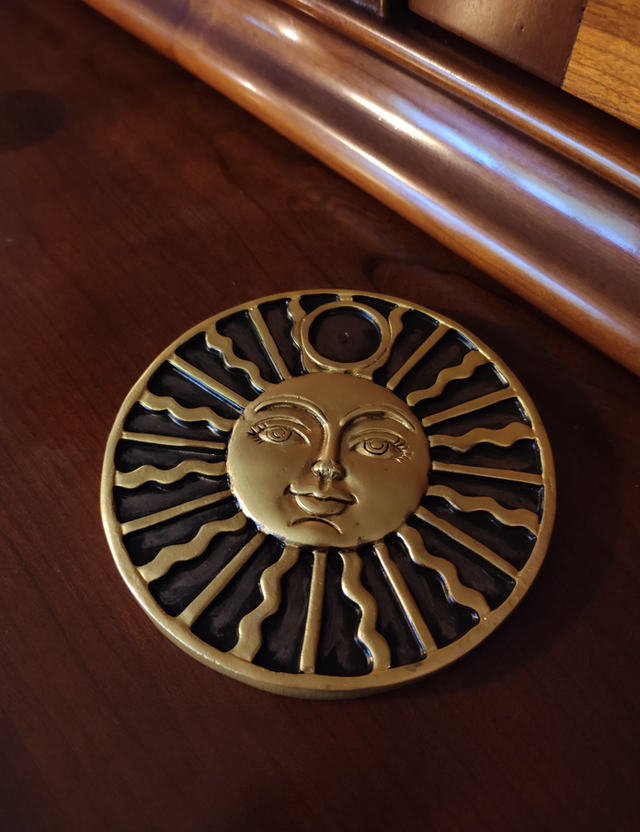 Fantastique porte-encens représentant le symbole du soleil, cette pièce magnifiquement conçue a reçu une finition dorée. Au milieu du soleil, on peut voir un visage, regardant vers le ciel. Au-dessus de son visage se trouve un petit trou où vous pouvez placer vos bâtons d'encens préférés.