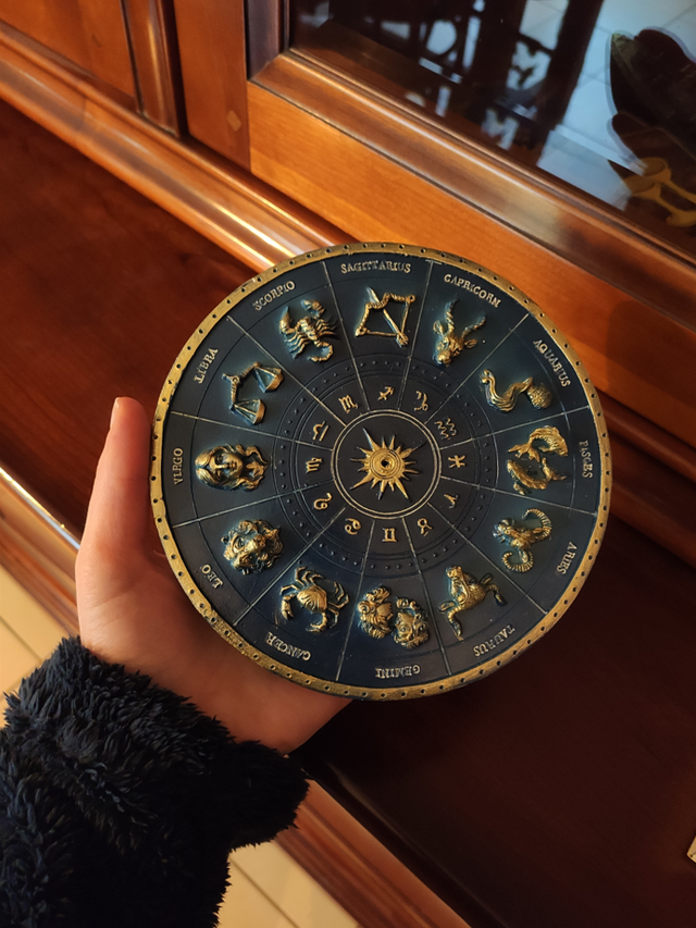 Porte-encens représentant la roue du zodiaque, bleu profond avec dorures.